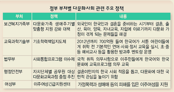 한국은 최근 몇 년 사이에 급격한 외국인 유입으로 다문화 사회로의 전환을 겪고 있습니다. 정부는 다문화 가정과 이민자 소통을 위한 다양한 정책을 시행하고 있으며, 이는 교육, 건강, 법률, 사회 복지 등 여러 분야에서 나타납니다.