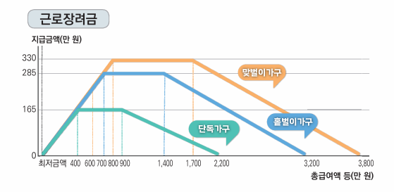 - 근로장려금 : 부부합산 연간 총소득이 단독가구 2,200만원, 홑벌이가구 3,200만원, 맞벌이가구 3,800만원 미만이어야 합니다.