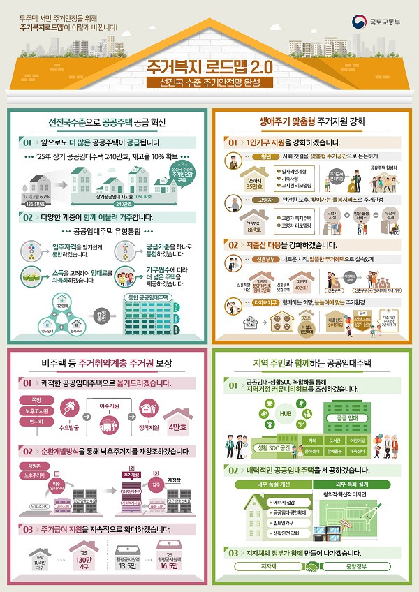 주거복지 로드맵 2.0은 크게 네 가지 주요 분야로 나뉘어 있습니다. 첫째, 공공 주택 공급 확대입니다. 정부는 공공 주택을 통해 저소득층과 중산층의 주거 안정을 도모할 계획입니다. 둘째, 가족 맞춤형 주택 지원입니다. 가족의 형태에 따라 다양한 주택 지원 프로그램이 마련될 것입니다. 셋째, 취약계층의 주거권 보호입니다. 비정규직 근로자나 저소득층을 위한 주거 지원이 강화될 것입니다. 마지막으로, 지역 주민과의 협력 프로젝트를 통해 지역 사회의 참여를 유도할 것입니다.