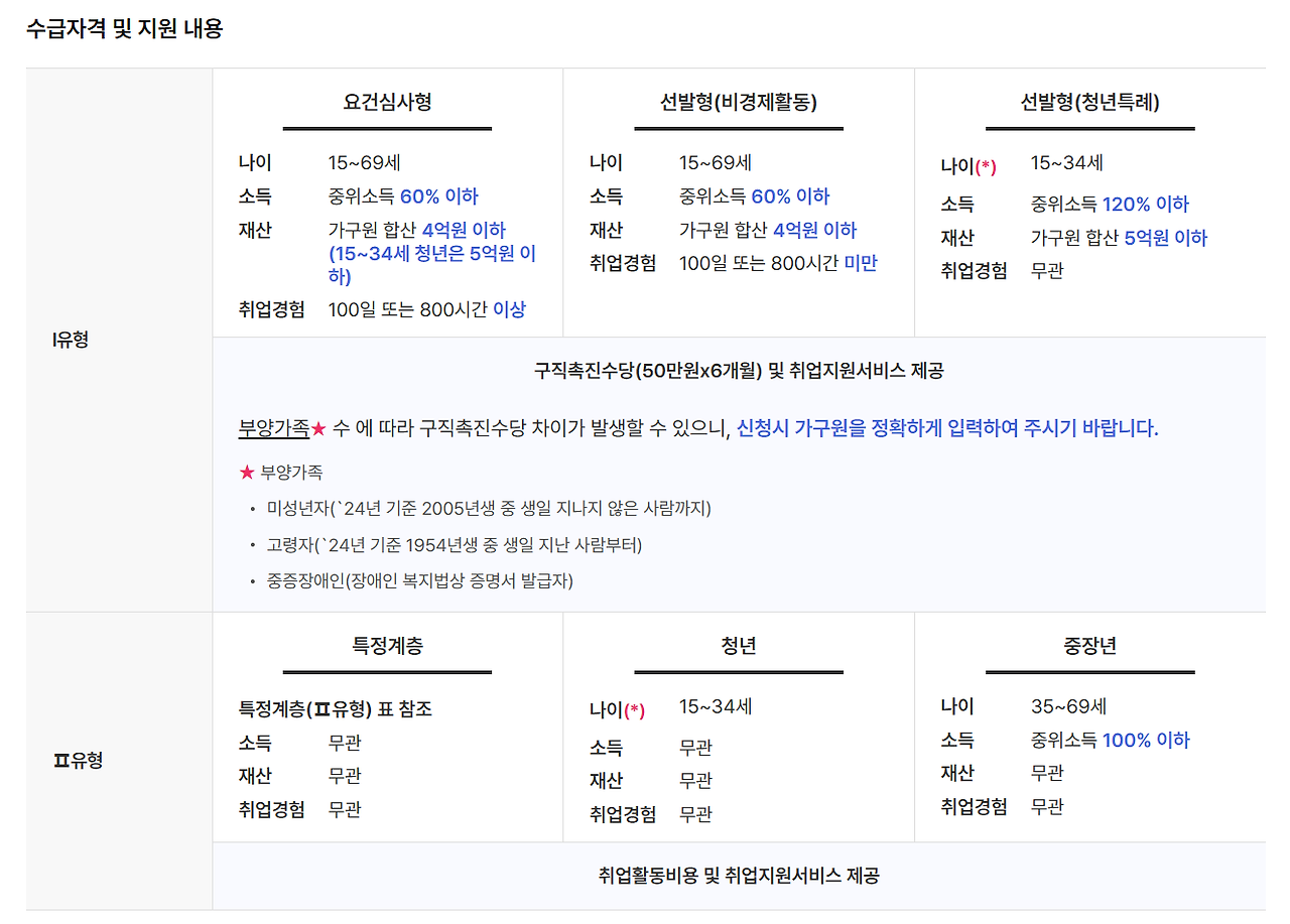 지원 대상은 다음과 같습니다. 2025년 기준으로, 만 18세 이상 64세 이하의 구직자 중 소득이 기준 이하인 경우 지원을 받을 수 있습니다. 또한, 자산 기준과 경력 요건도 충족해야 합니다. 특히, 청년층과 중장년층을 위한 특별한 조건이 마련되어 있습니다.